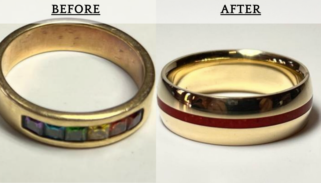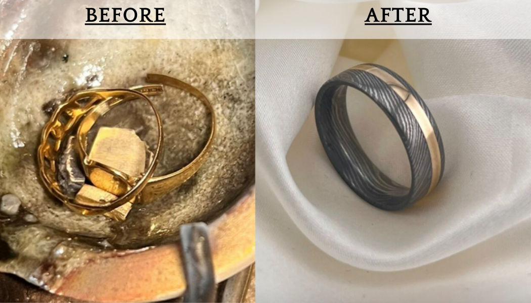 • My customer was terminally ill and feared he would not be here to attend his brothers upcoming wedding but wanted to be a part of it somehow, so he gave me a gold ring which was a family heirloom and asked me to reinvent it into a wedding band for his little brother. He chose a red inlay to represent their Welsh heritage.