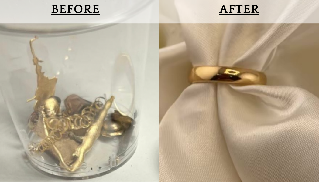 • My customer had scrap gold that didn't hold any sentimental value, but knew it would help to reduce the cost of her wedding band to supply include it in the making process. The customer went for a simple 5mm court band.