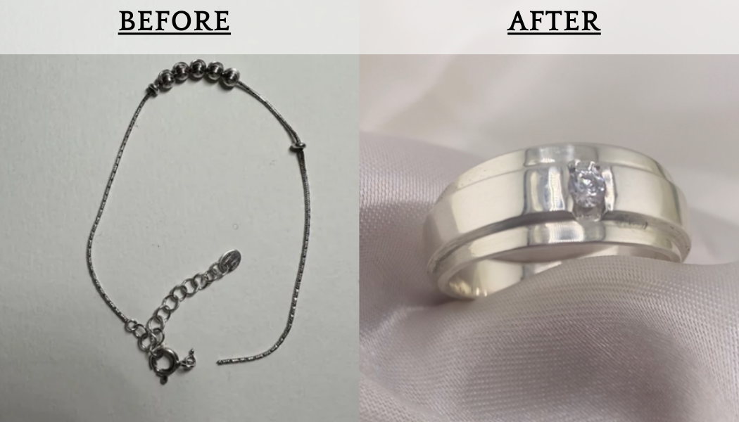 • My customer had a broken Silver bracelet that held sentimental value that she wanted incorporated into her wedding ring. She chose a diamond band design, and I needed to add extra silver for it, so her bracelet was melted with extra silver bullion to make this custom design, along with a 0.10 carats diamond.