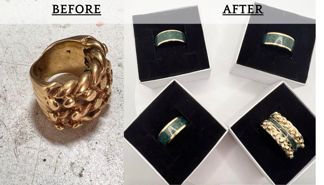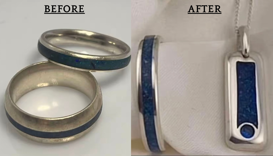 • We were contacted by a customer that had previously ordered a wedding band set requesting us to reinvent the set into a memorial ring and pendant set as her husband had very sadly passed away. It was one of his final wishes that we melt their rings together to create a memorial set for his ashes once he passed. This was tremendously sad, and a true honour.