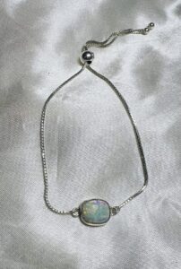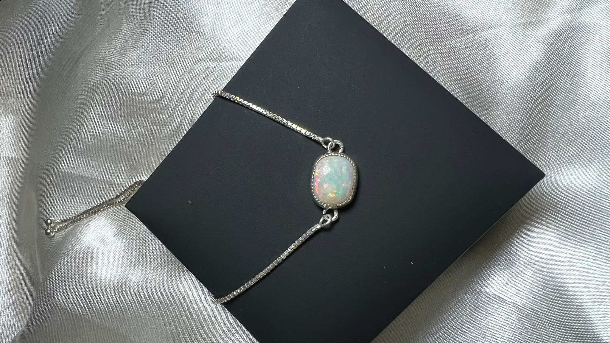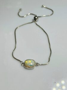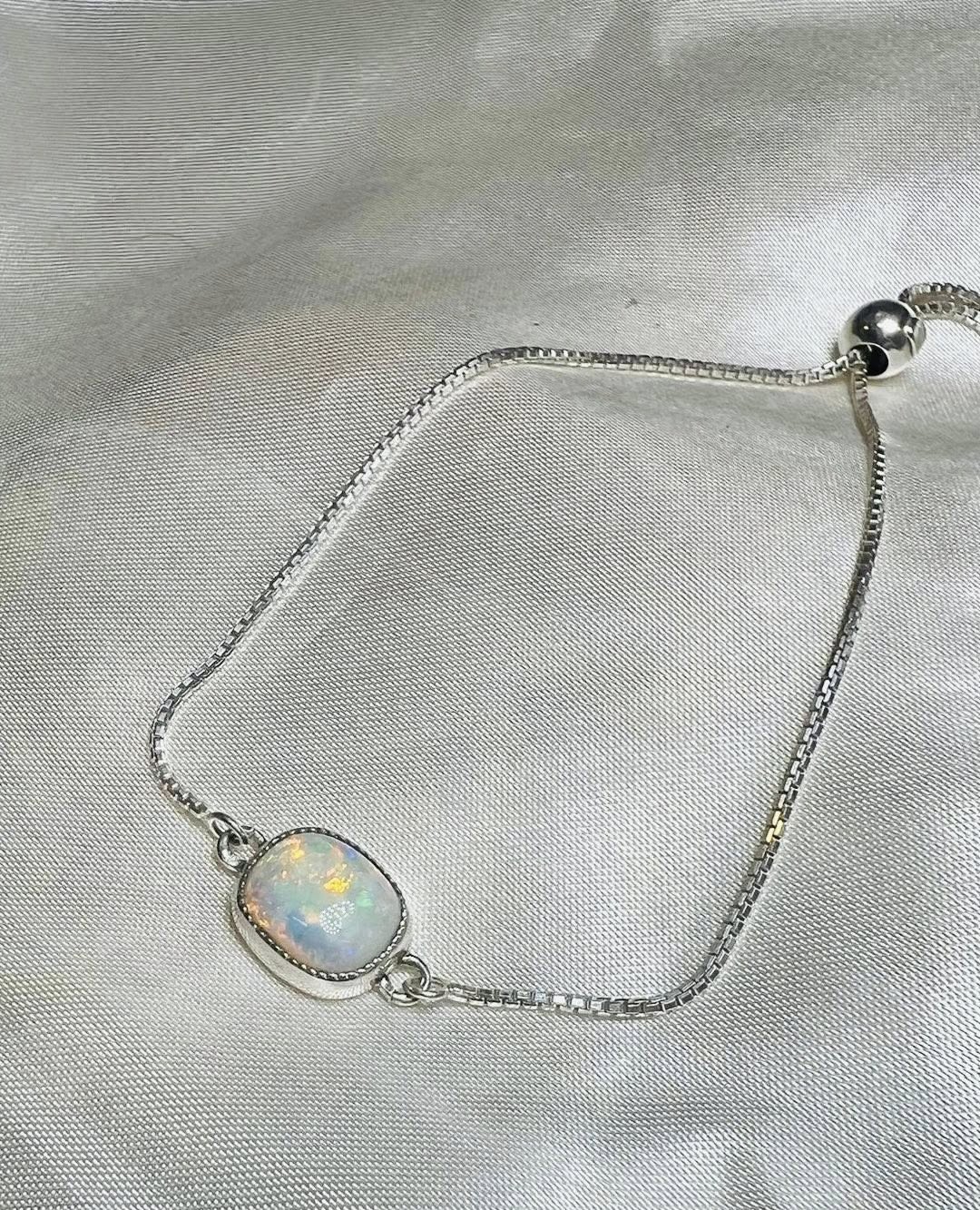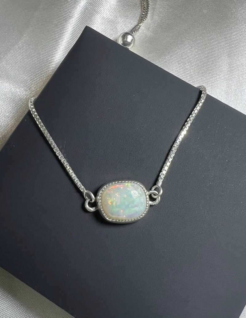 This beautiful handcrafted Sterling Silver 925 adjustable ball clasp and box chain bracelet features a Cober Pedy Shell Opal (1.95 carats) which has distinctive colour qualities that is set into a delicate millgrain half-set bezel.