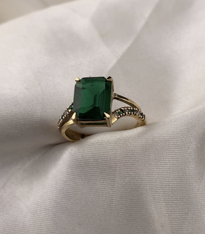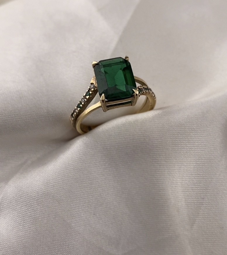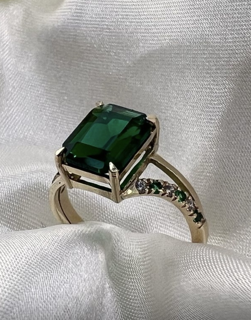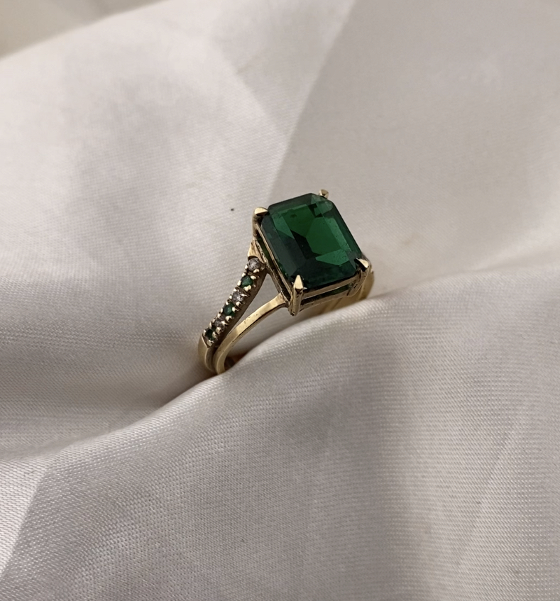 This beautiful emerald cut ring is handmade with split sides that feature alternating semi-precious stones (1.5mm) to compliment top stone.