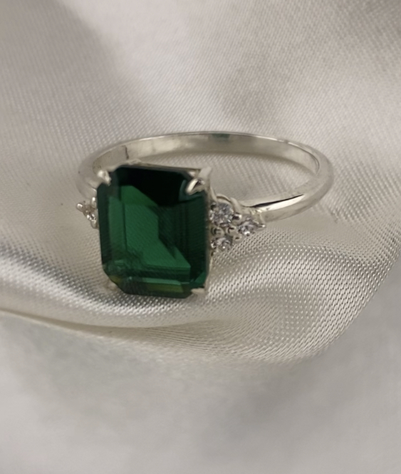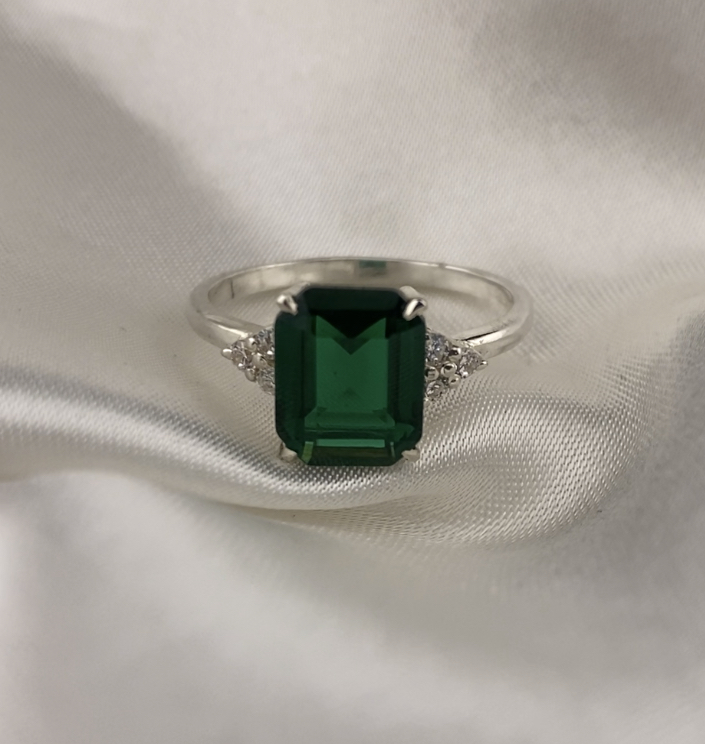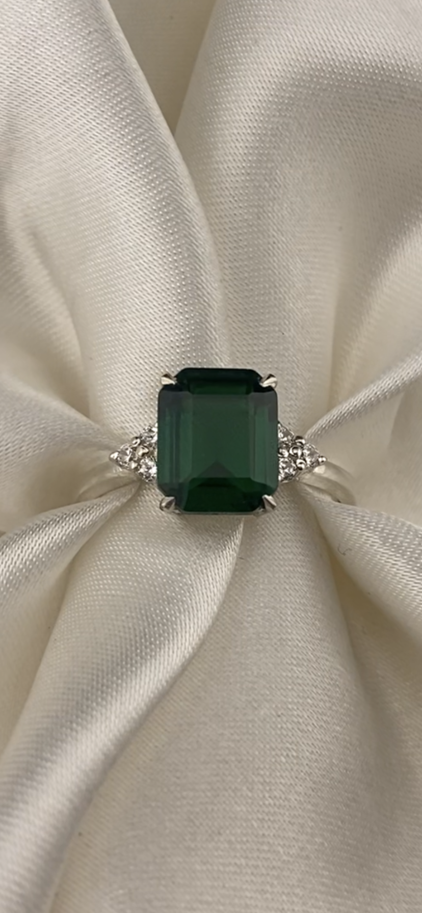 This beautiful emerald cut cluster is handmade and features an emerald cut top stone is 8 x 10 mm, which is available in various colours (see options).