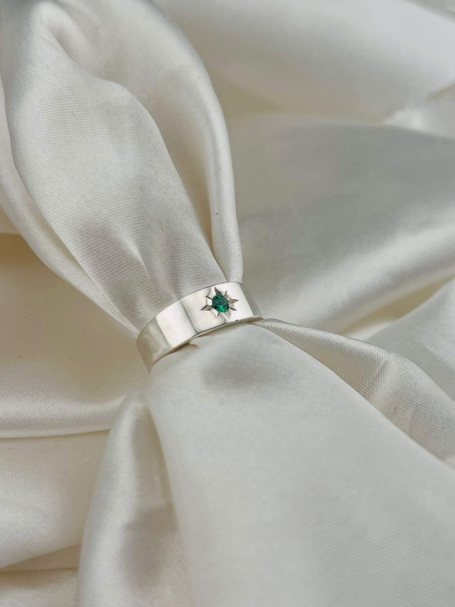 This 8mm band is handmade with a star setting 3mm brilliant cut AGL certified emerald stone (0.08 carat).