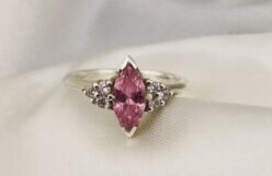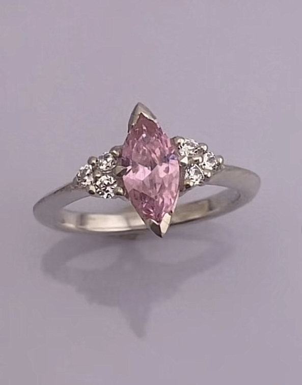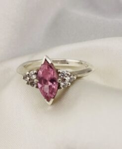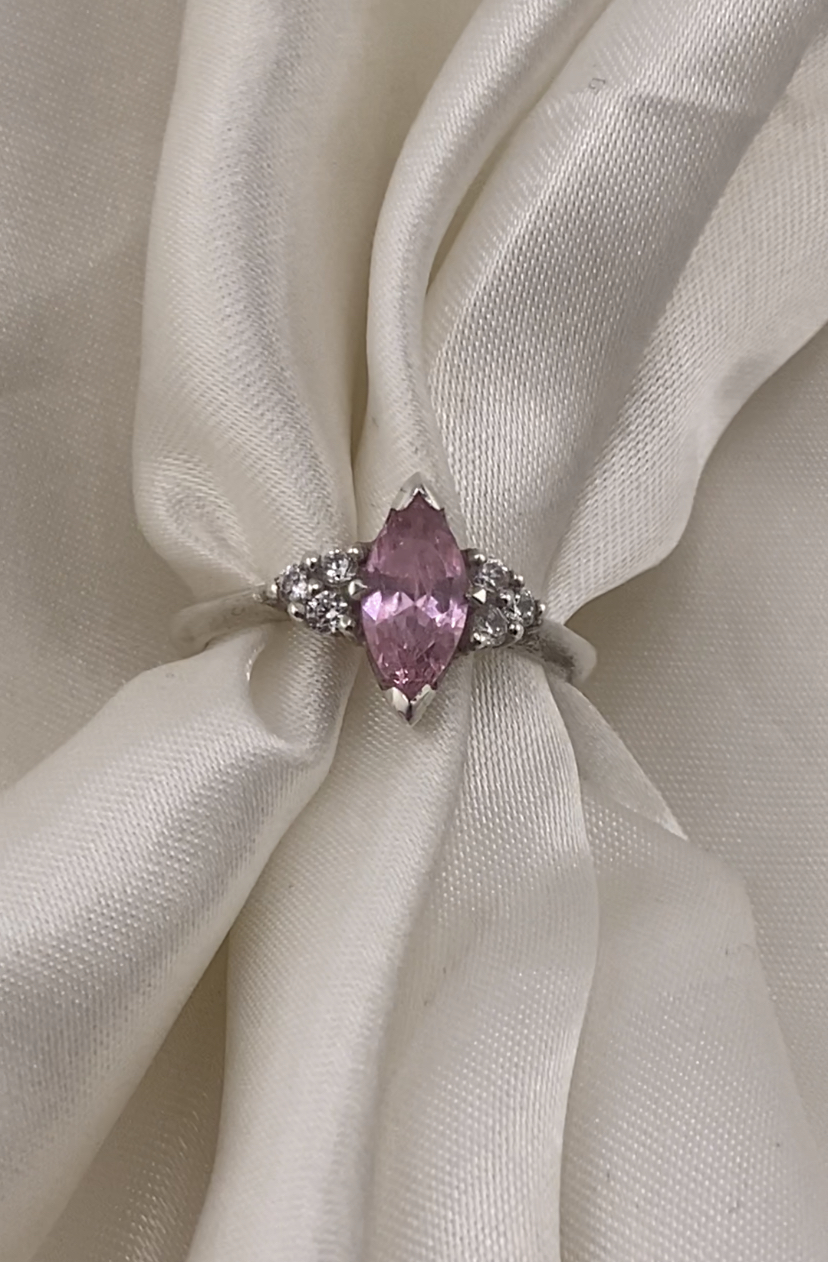 This beautiful semi-precious ring is handmade and features a marquise stone is 8 x 4 mm which is available in various colours (see options), and accent trinity cluster stones in white.
