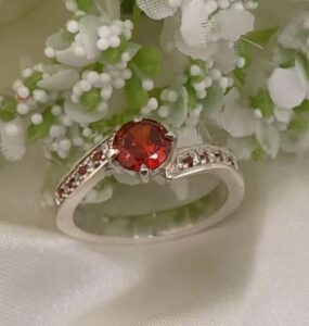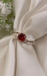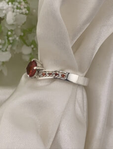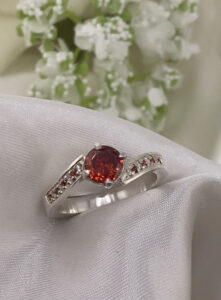 This beautiful solitaire ring is handmade with a 6mm brilliant cut semi-precious top stone and offset pave channel sides with 1.5mm alternating stones in white and colour (complimenting to top stone).