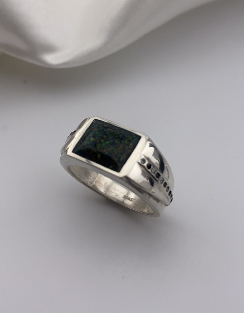Handmade rectangle signet ring with coloured opal top setting and complimenting accent semi-precious stones.