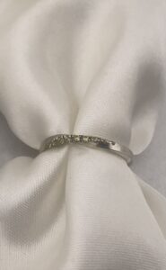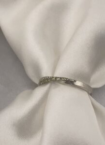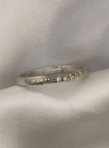 This beautiful semi-precious ring is handmade and features 9 x 1.5mm peridot stones in a ribbon twist setting. Size P.