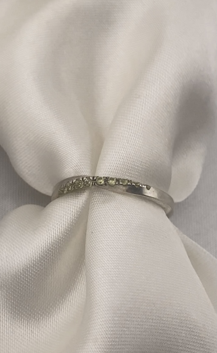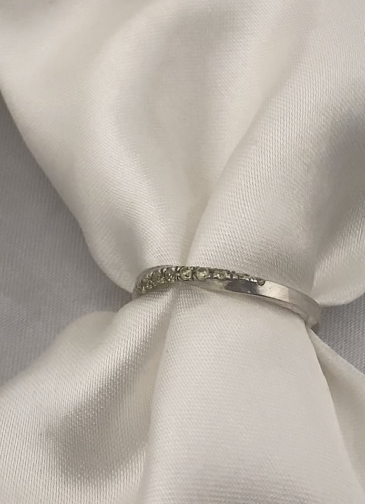 This beautiful semi-precious ring is handmade and features 9 x 1.5mm peridot stones in a ribbon twist setting. Size P.