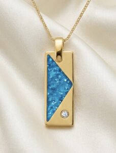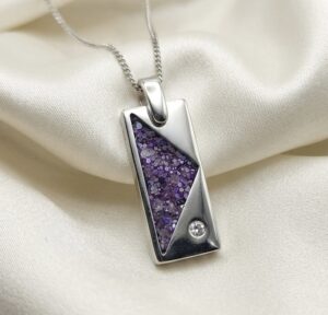 Handcrafted rectangle pendant with envelope-style setting featuring ashes delicately encased with resin, and matching high quality Cubic Zirconia solitaire stone.