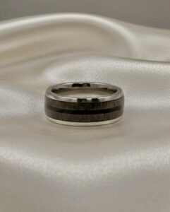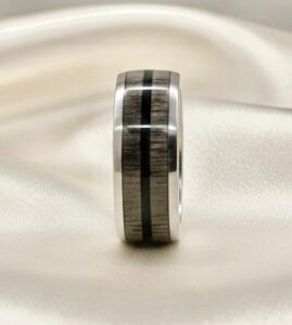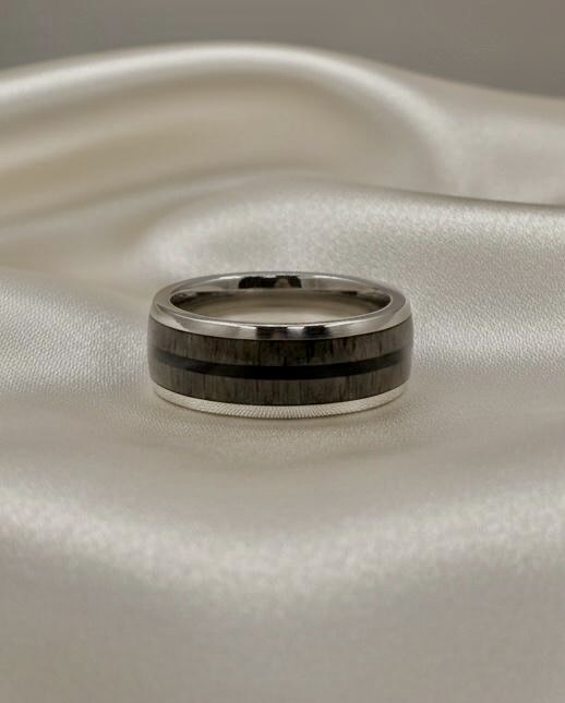 Handcrafted 8mm executive-style flat deer antler band with narrow central encased remembrance inlay and precious metal core.