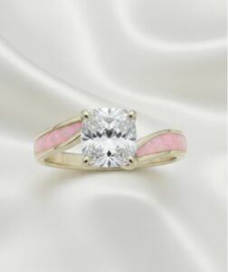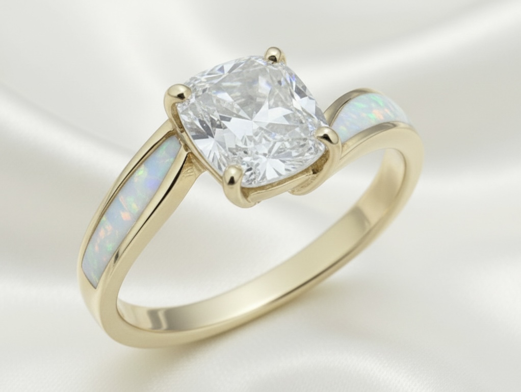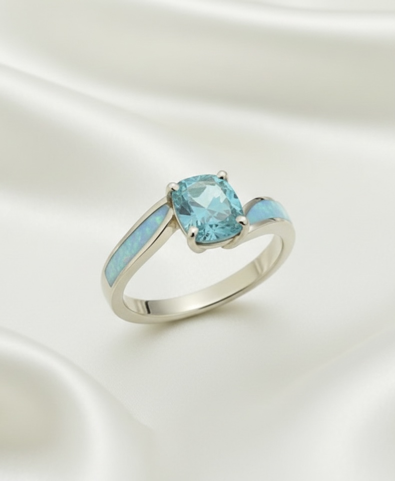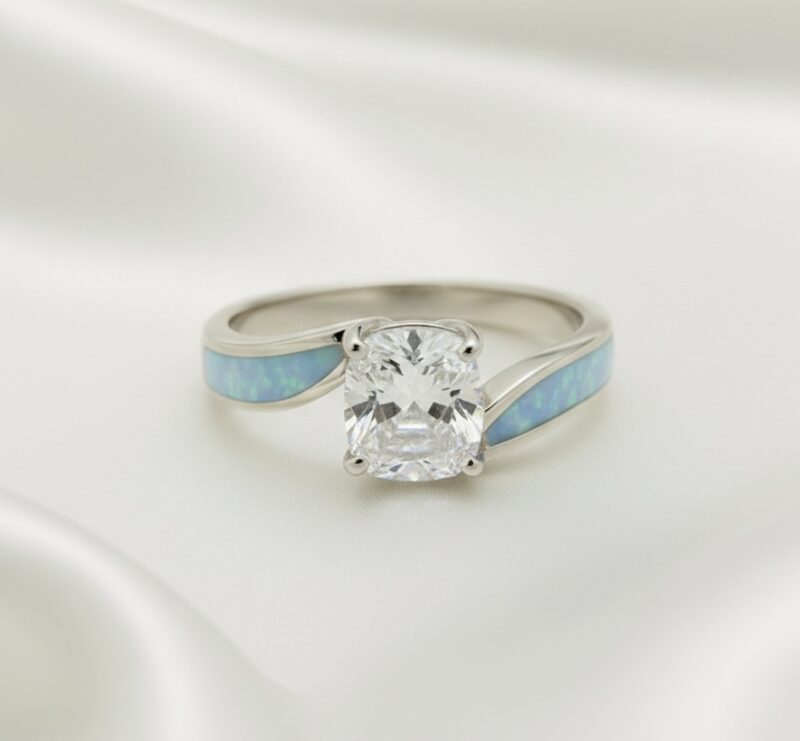This beautifully handcrafted ring features a high quality 8 x 8mm cushion cut Cubic Zirconia top stone set into offset ring with sides featuring ashes and opal delicately encased in resin.