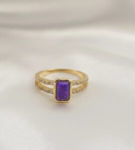 This beautiful ring is handcrafted and features a 8mm x 6mm emerald rubover cup which is delicately filled with ashes in resin, and also features high quality Cubic Zirconias split shank sides.