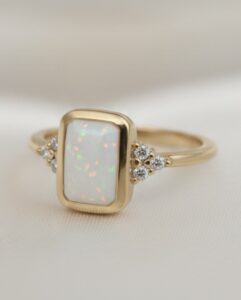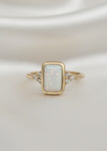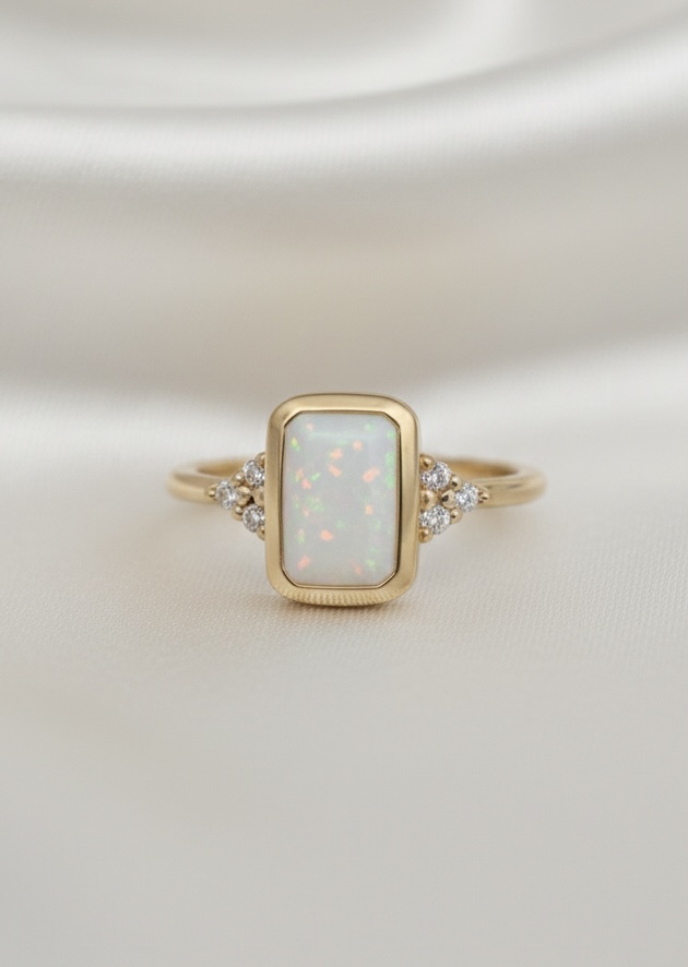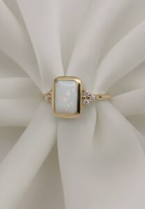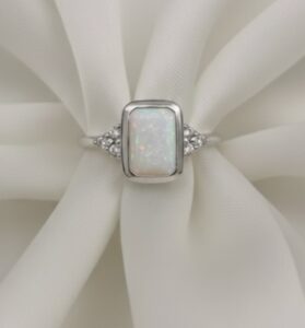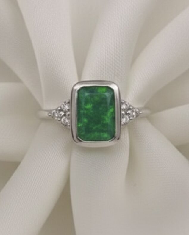 This beautiful ring is handcrafted and features a 10mm x 8mm emerald rubover cup delicately filled with ashes and opal encased in resin, along with 1.5mm trinity cluster sides (high quality Cubic Zirconias).