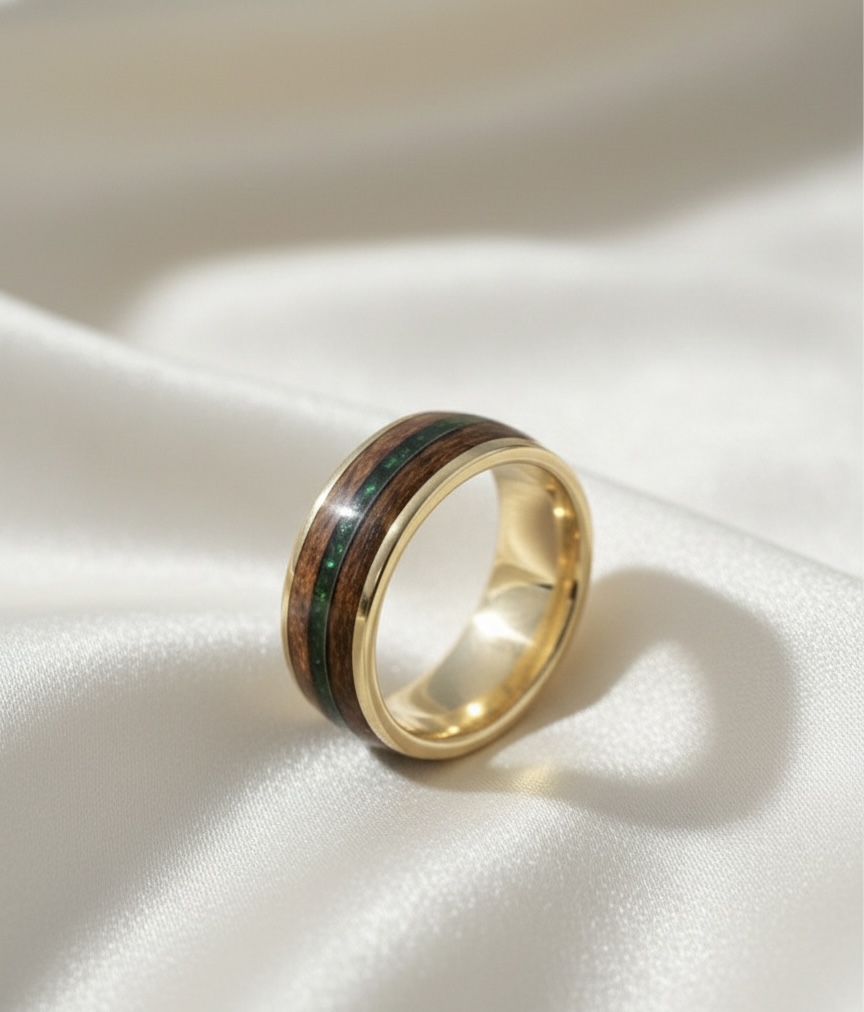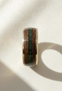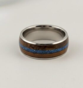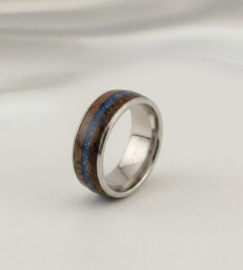 Handcrafted 8mm executive-style court wood band with narrow central inlay delicately filled with ashes and opal encased within resin and precious metal core.