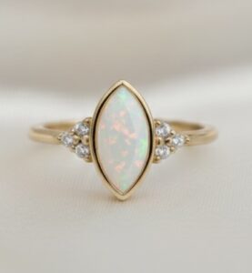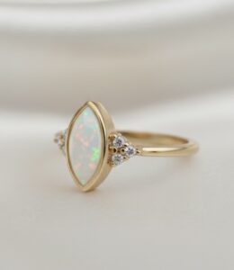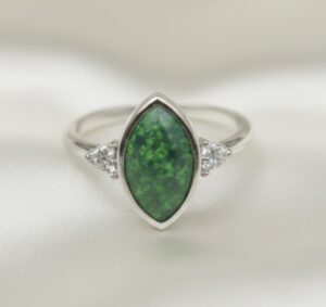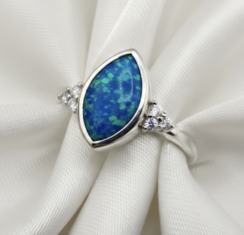 This beautiful memorial ring is handcrafted and features a 10mm x 6mm marquise rubover memorial cup which is delicately filled with ashes and opal encased within resin, along with 1.5mm trinity cluster sides (high quality Cubic Zirconias).