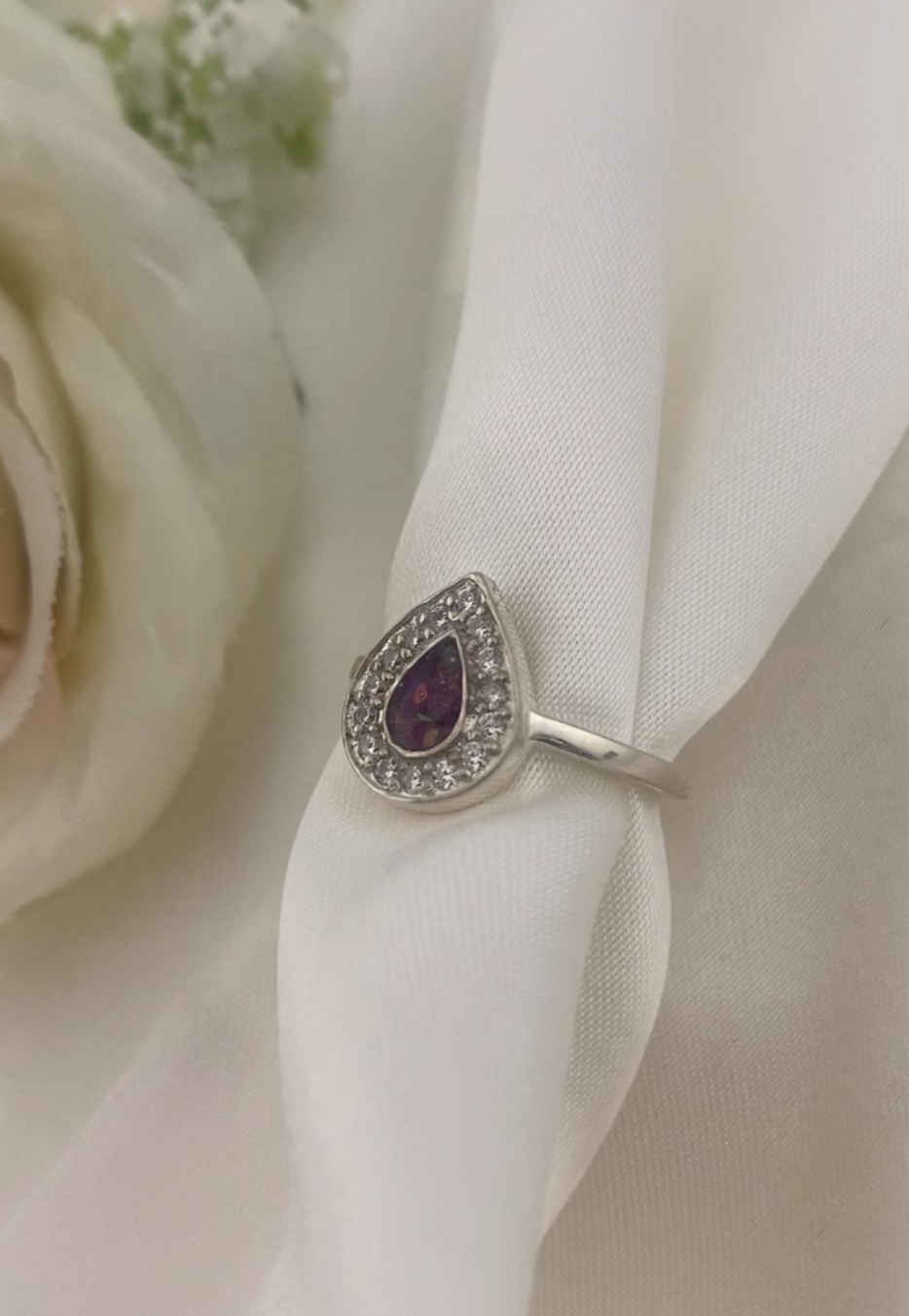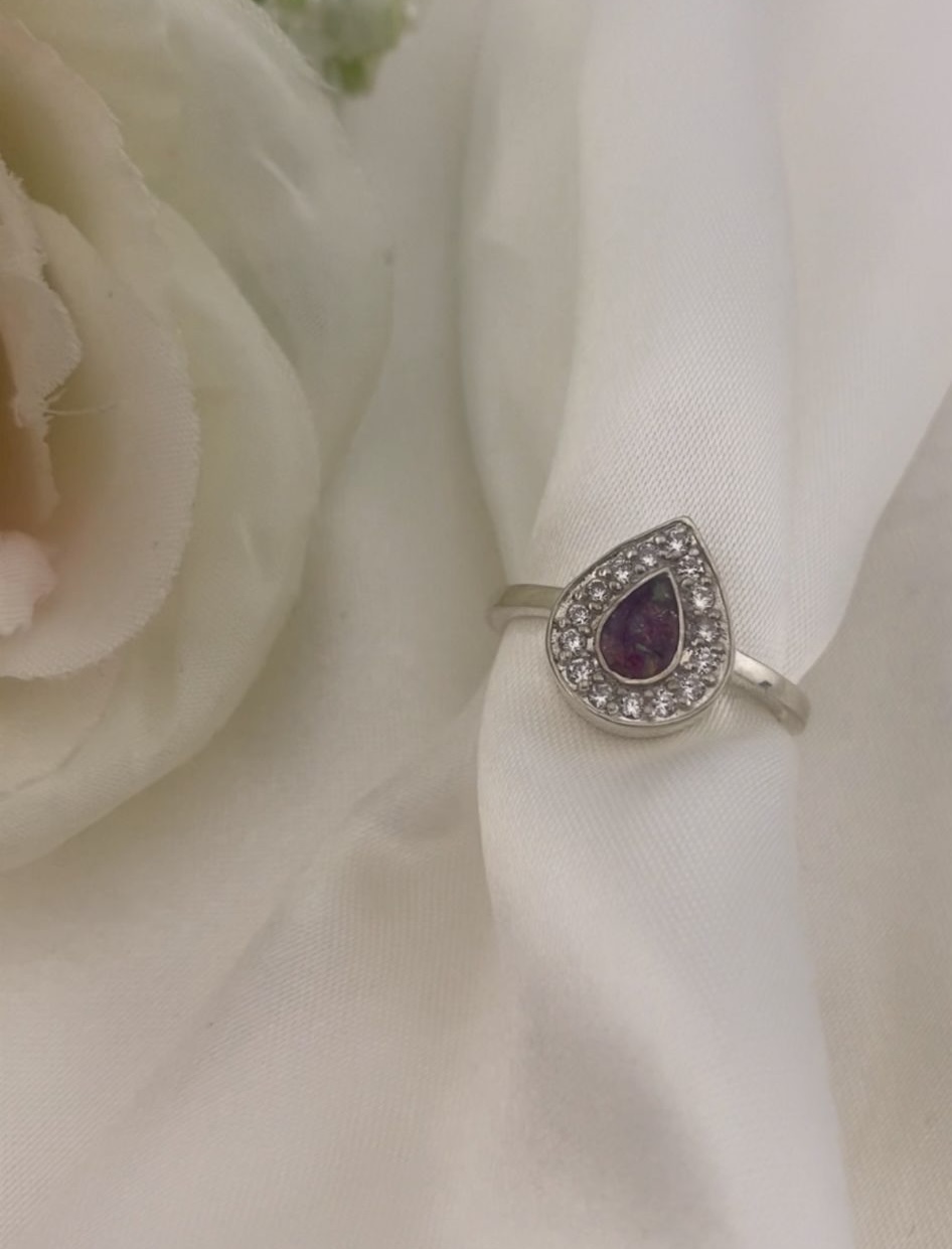 Hand-finished Sterling Silver 925 curved teardrop ring. Features 5 x 7mm bezel and full white fine crystal surround.