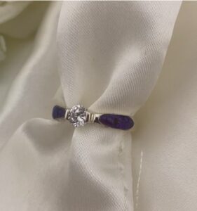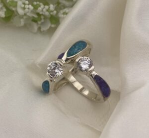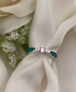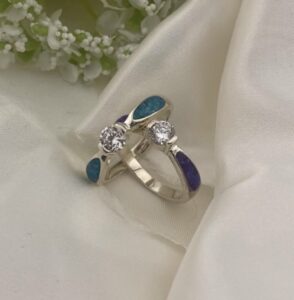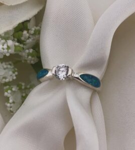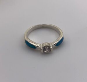 Hand-finished Solitaire Inlay Ring. Features white fine crystal brilliant cut stone and inlay sides.