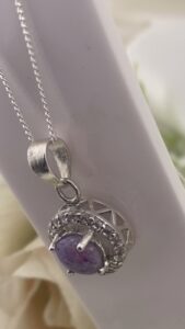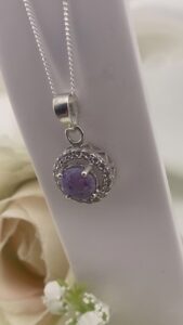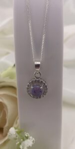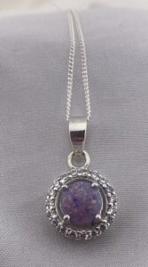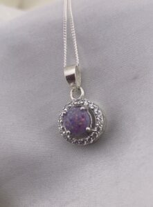 This pendant features a handmade round ashes and opal stone (8mm) with fine crystal floating halo crown surround.