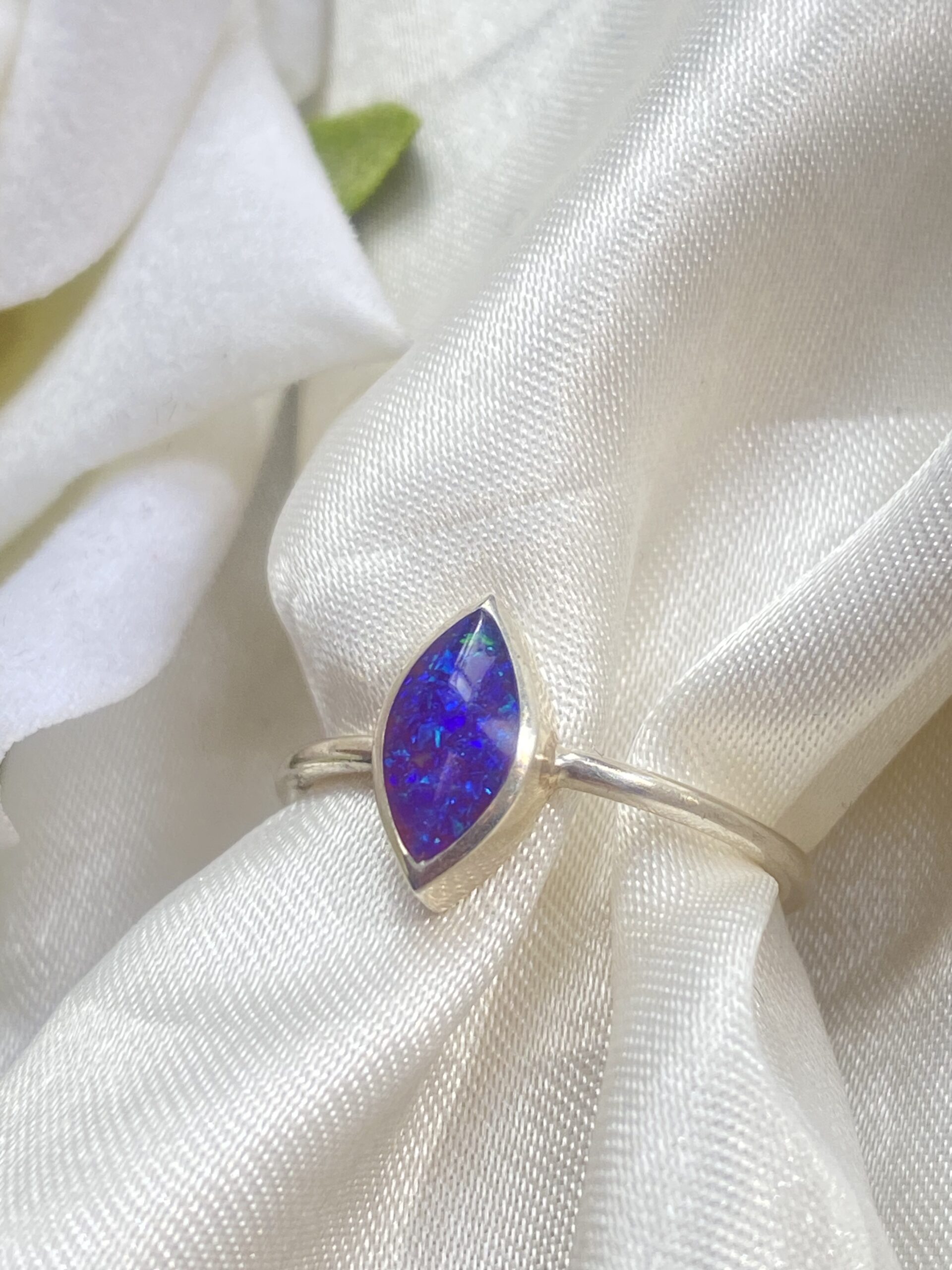 Handmade marquise ashes and opal ring with rubover fit setting.