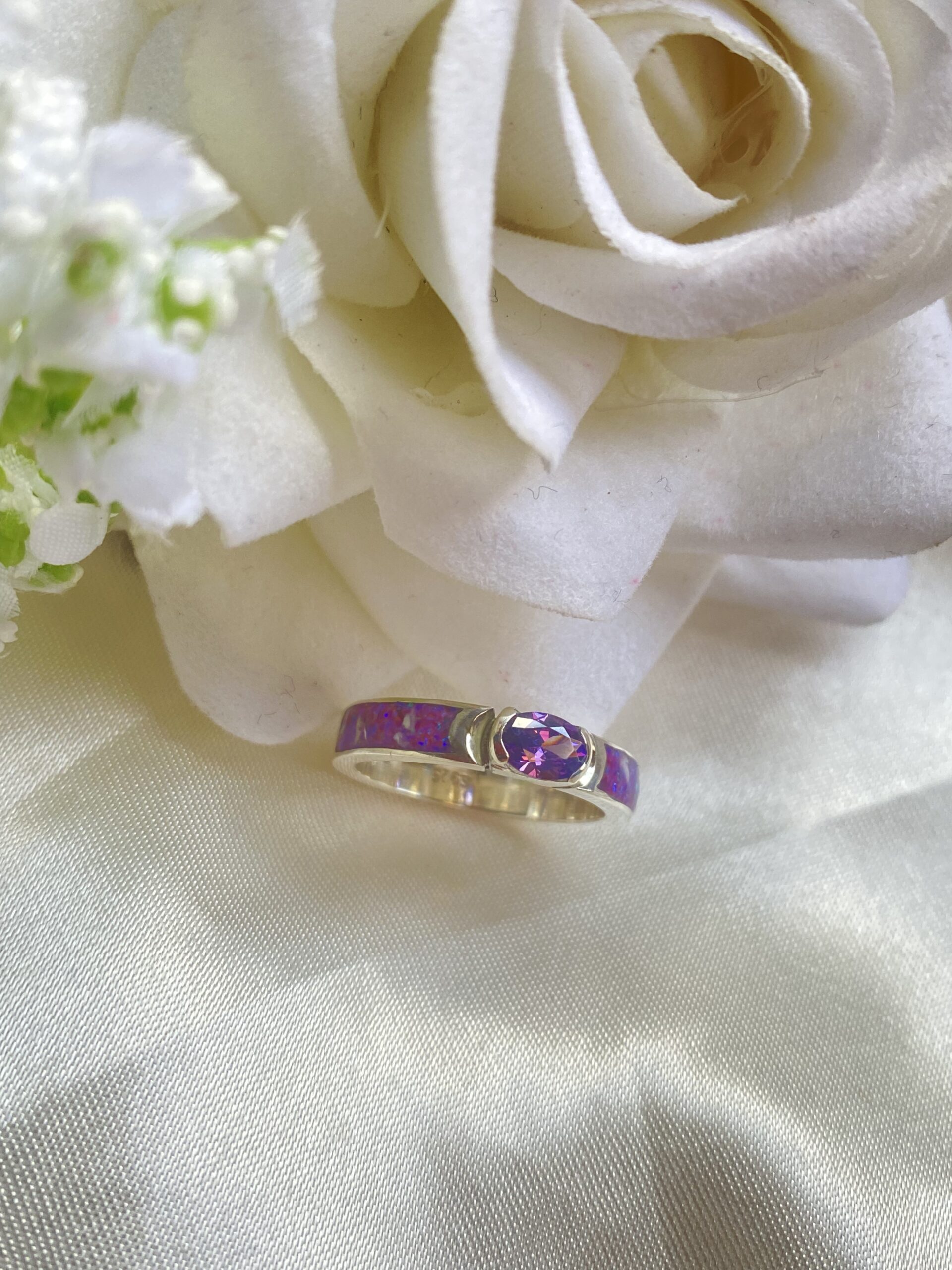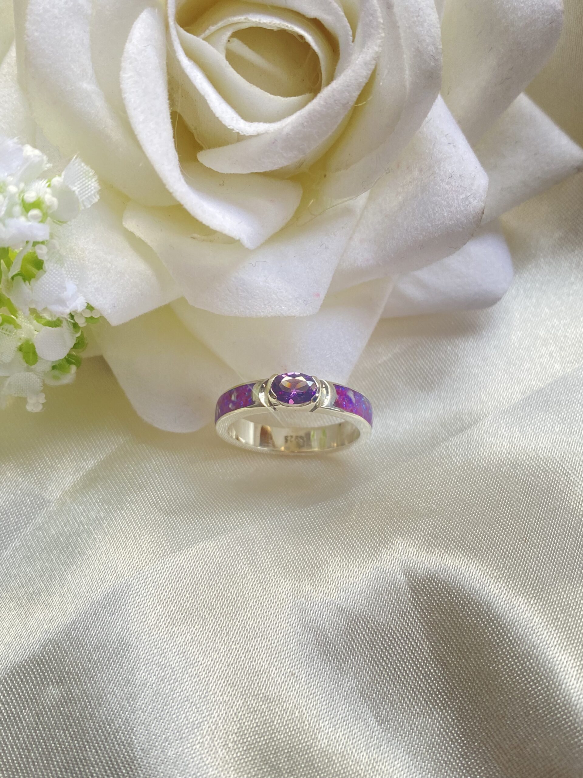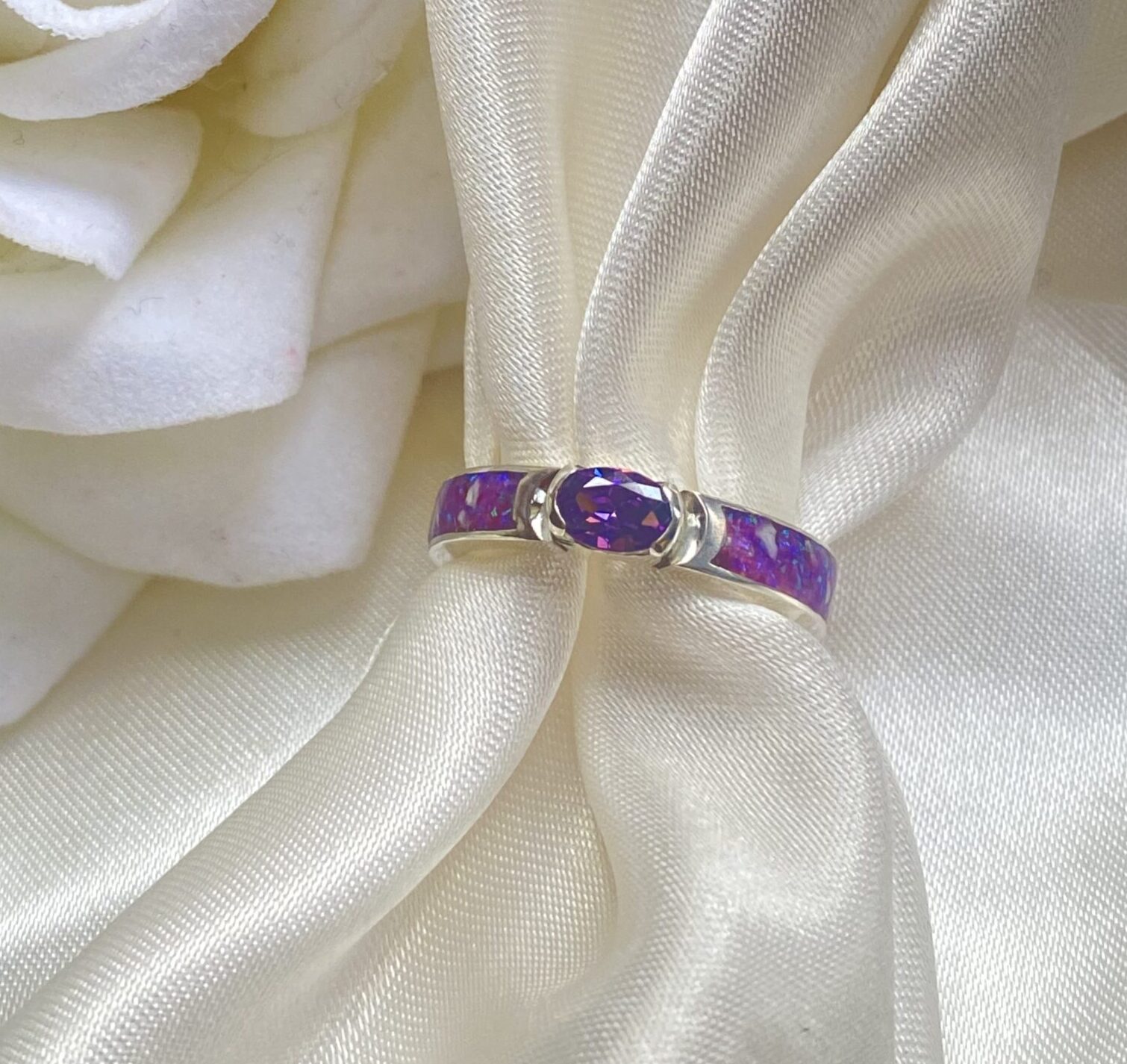 This unique memorial handmade ring features an oval east-to-west stone (6mm x 4mm) and inlay sides.
