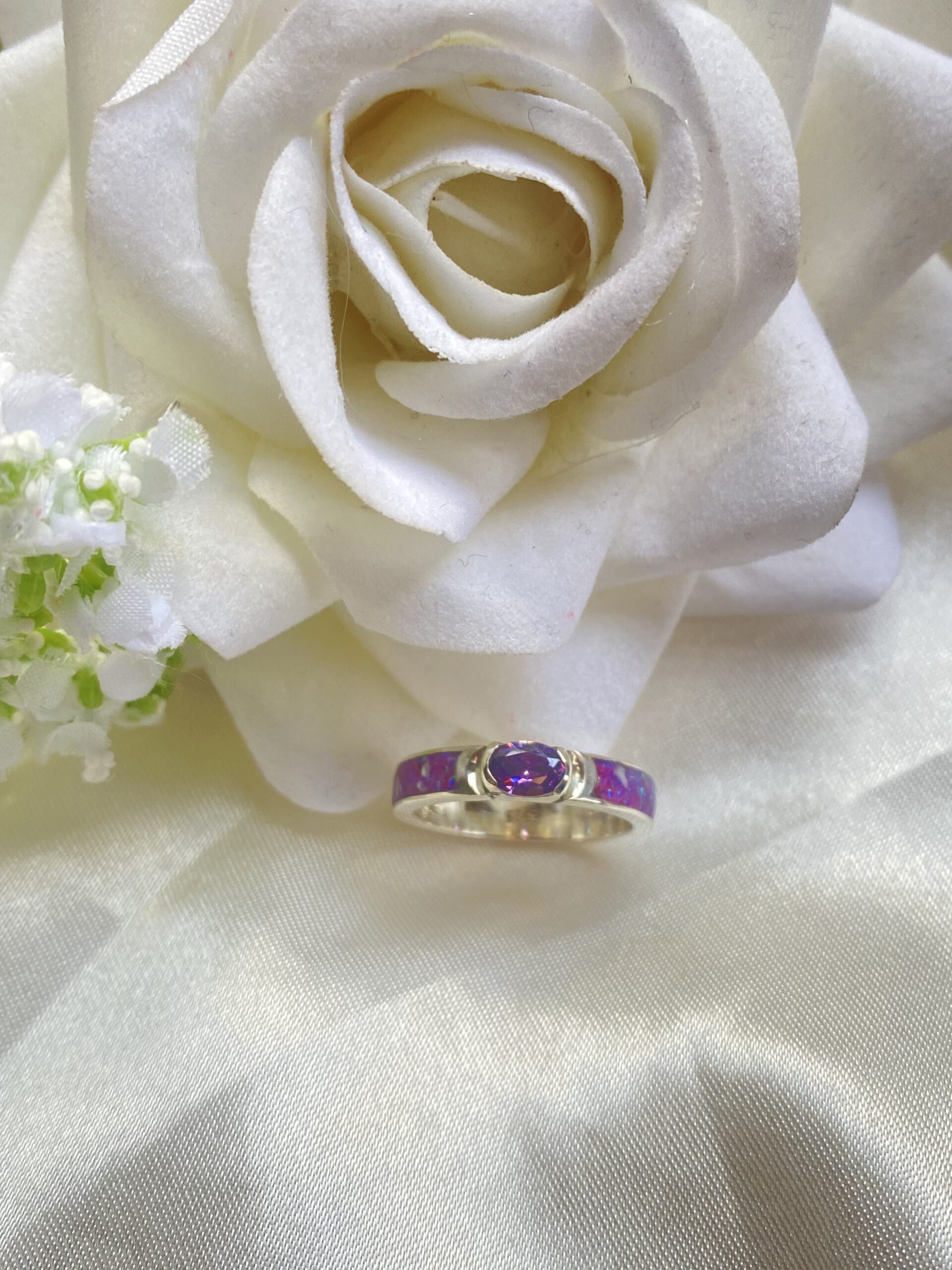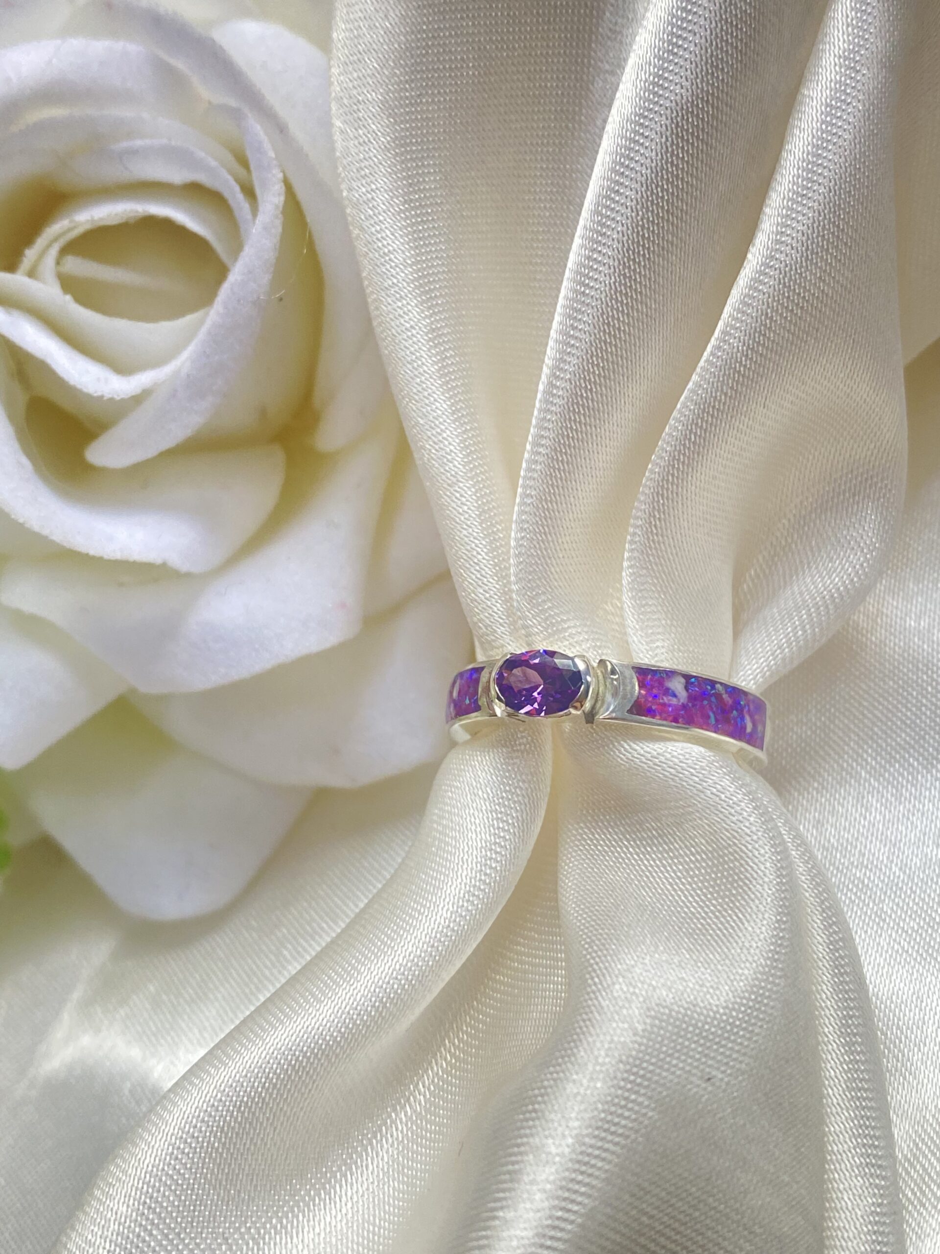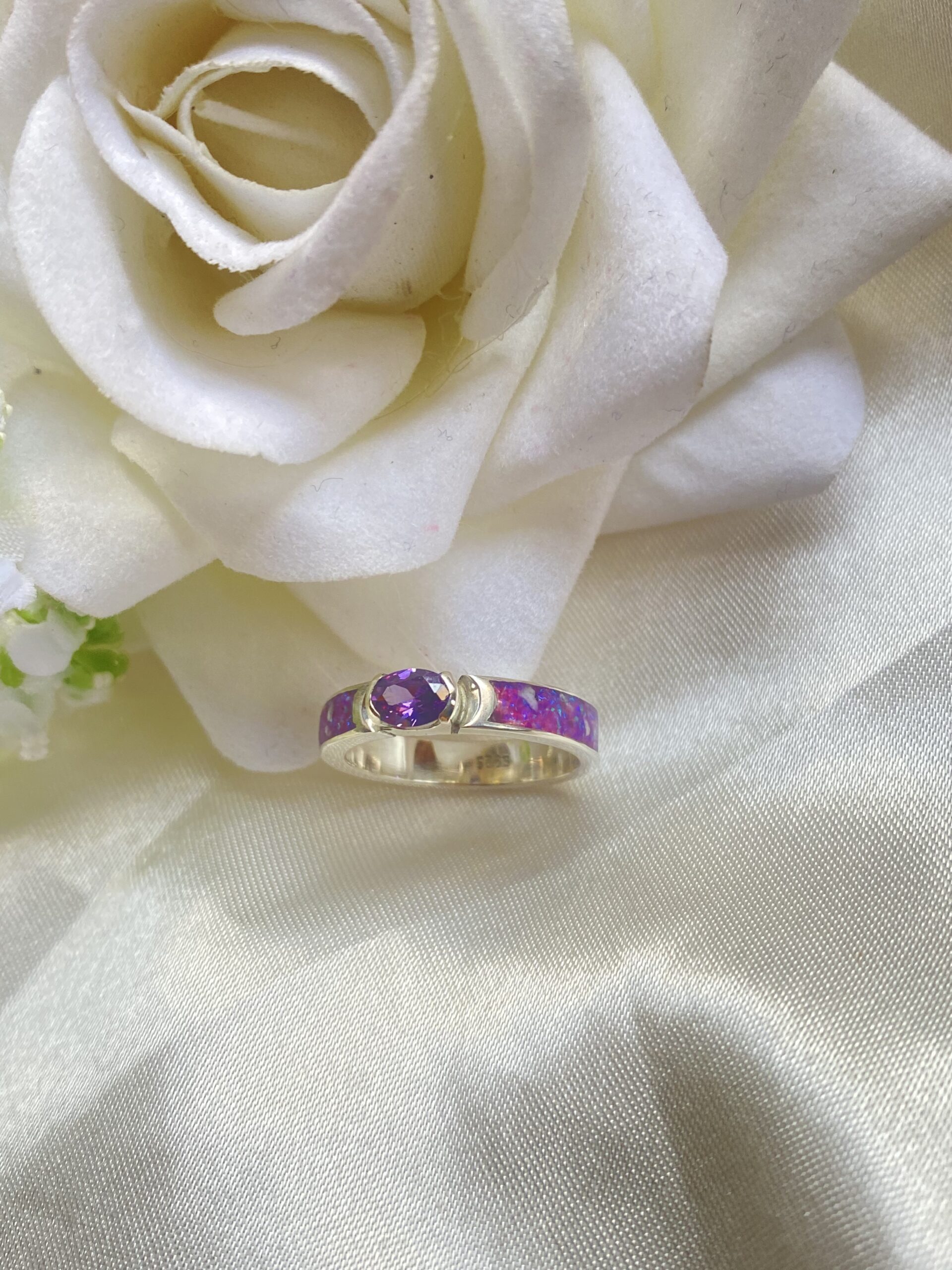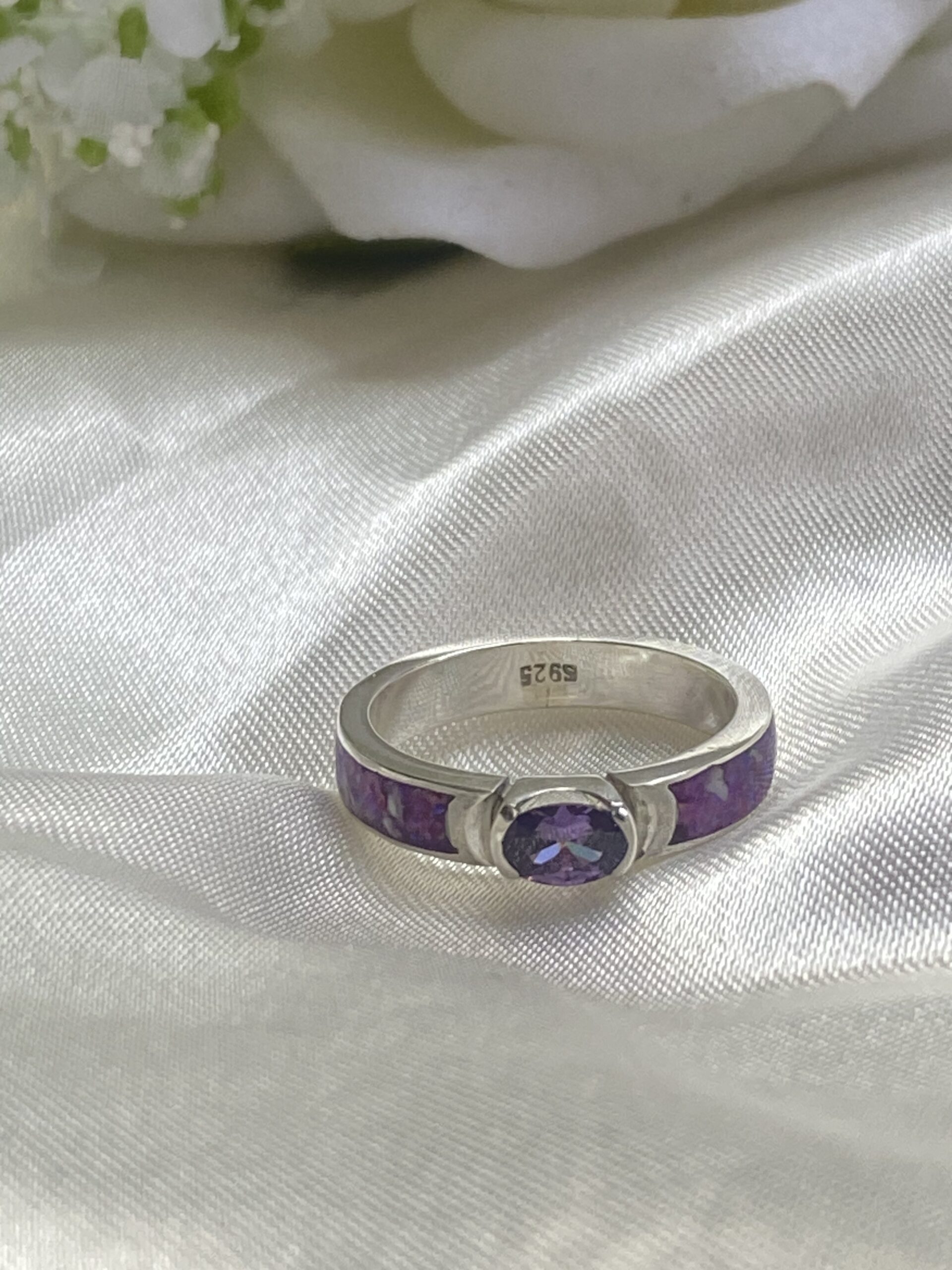This unique memorial handmade ring features an oval east-to-west stone (6mm x 4mm) and inlay sides.