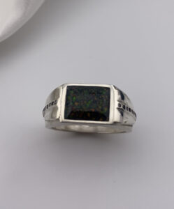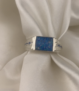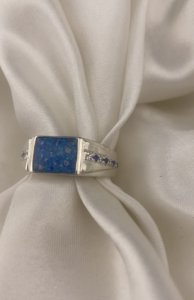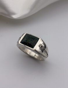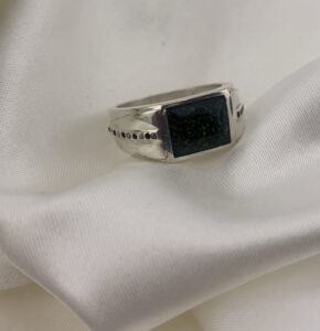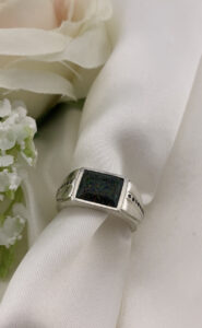 Handmade rectangle memorial signet ring with coloured ashes top setting and complimenting accent semi-precious stones.