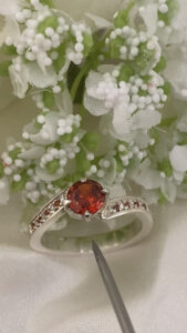 This beautiful solitaire memorial ring is handmade with a 6mm brilliant cut semi-precious top stone and offset pave channel sides with 1.5mm alternating stones (white and complimenting to top stone).