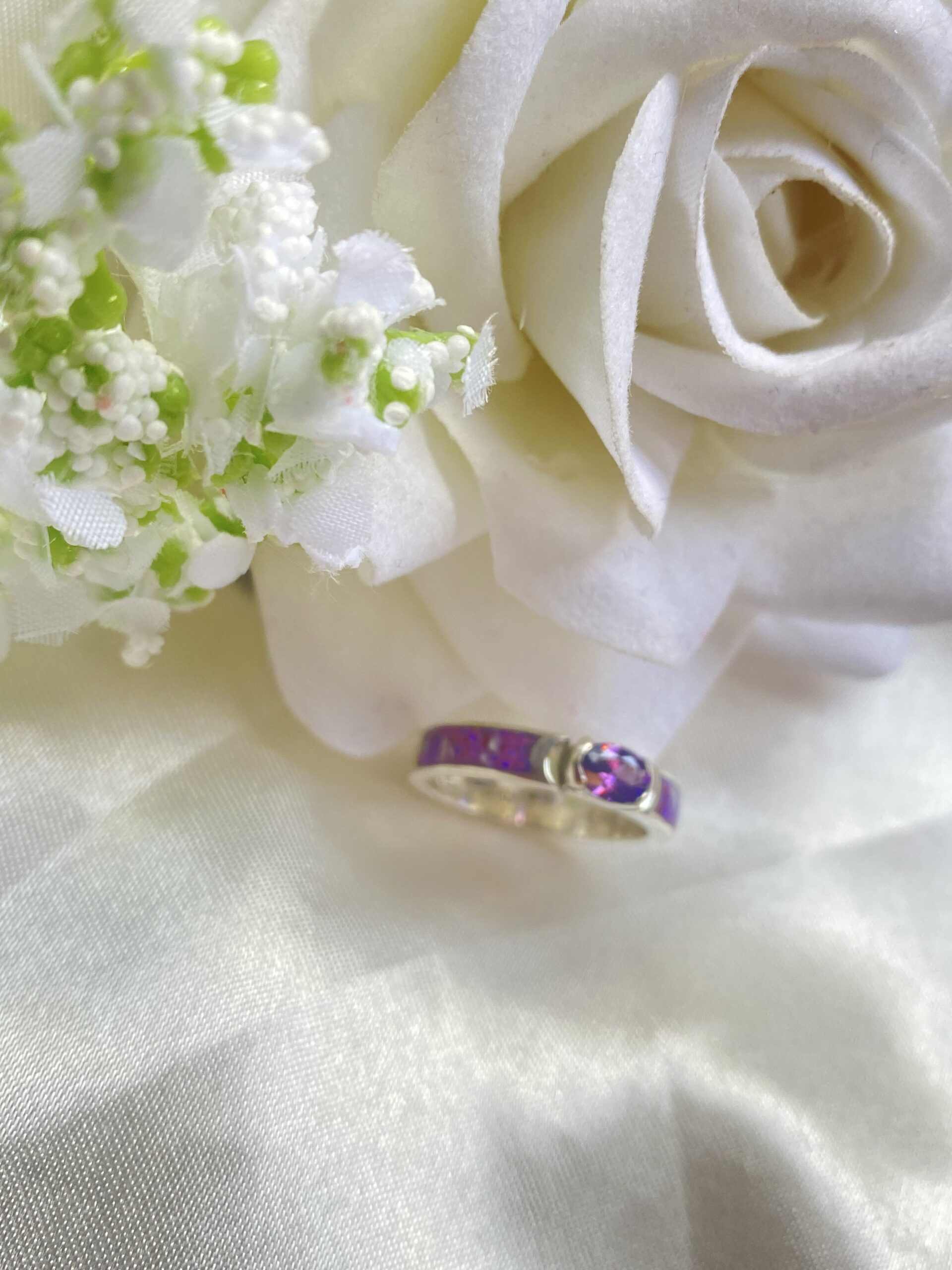 This beautiful memorial ring is handmade from your sentimental silver/gold and features an oval east-to-west stone (6mm x 4mm) and inlay sides.