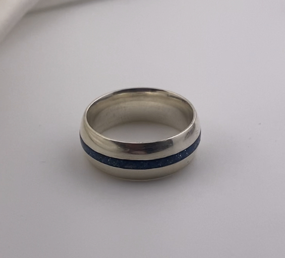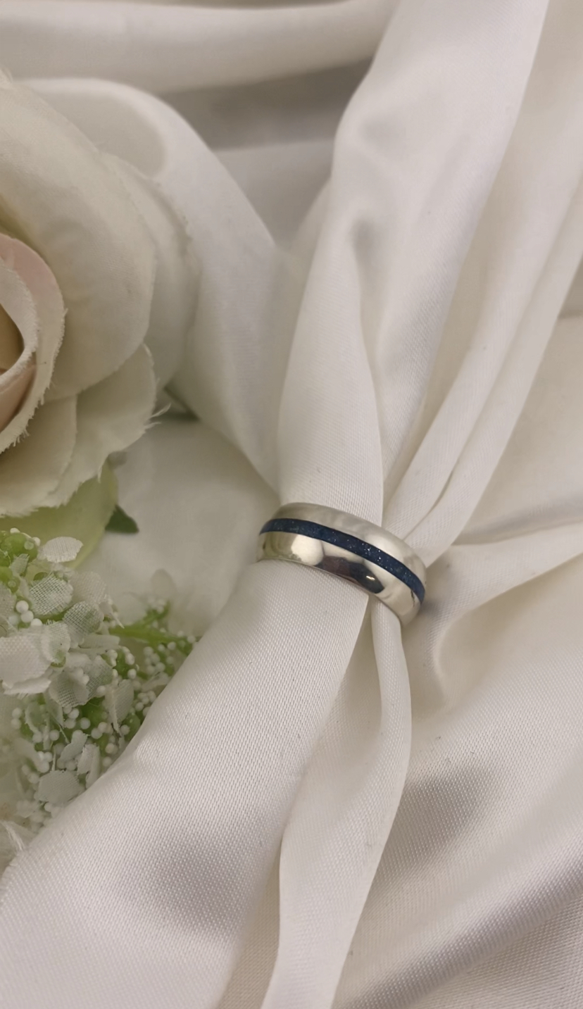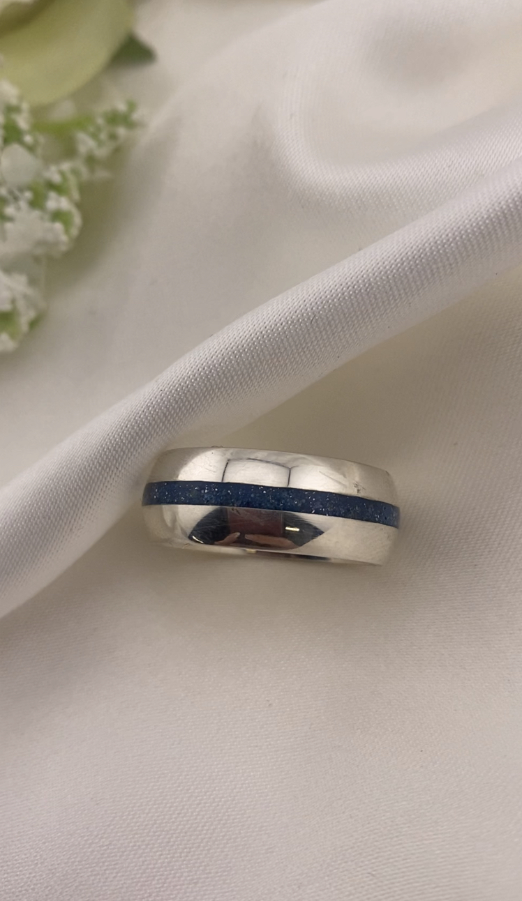 This beautiful 8mm band is handmade from your sentimental silver/gold and features a narrow central inlay in the opal colour of your choice.