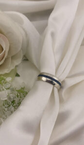 This beautiful 8mm band is handmade from your sentimental silver/gold and features a narrow central inlay in the opal colour of your choice.