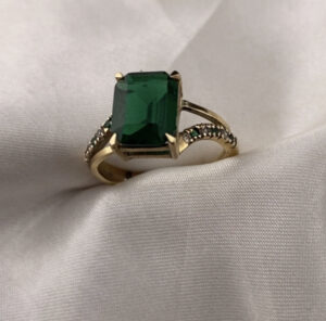 This beautiful emerald cut ring has split sides that feature alternating semi-precious stones (1.5mm) to compliment top stone and is handmade from your sentimental silver/gold.