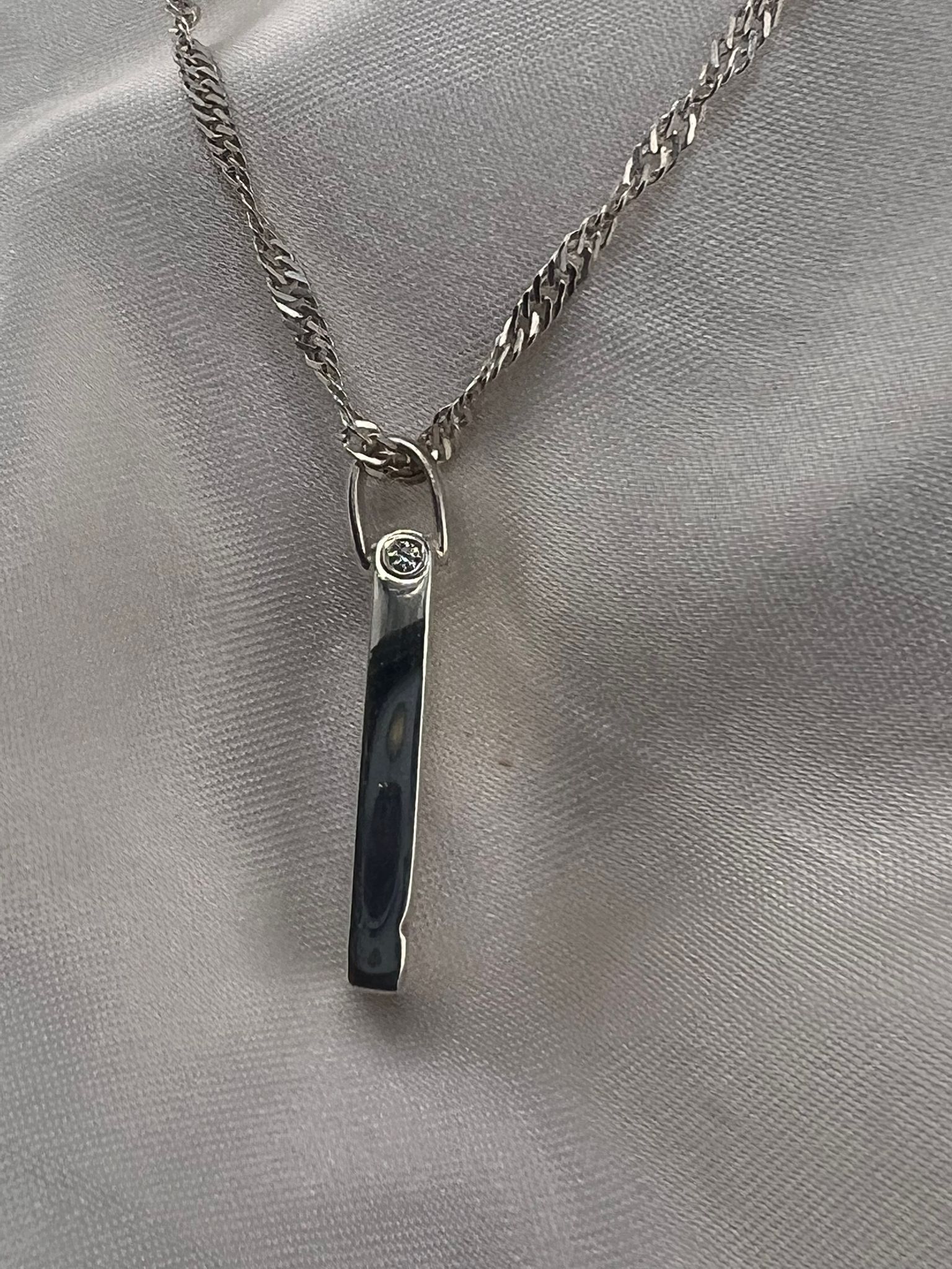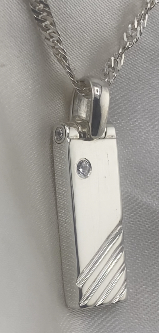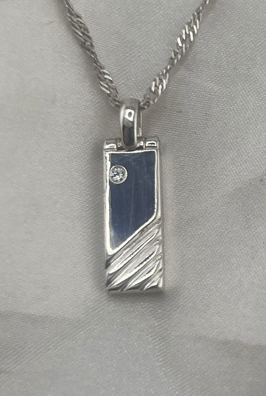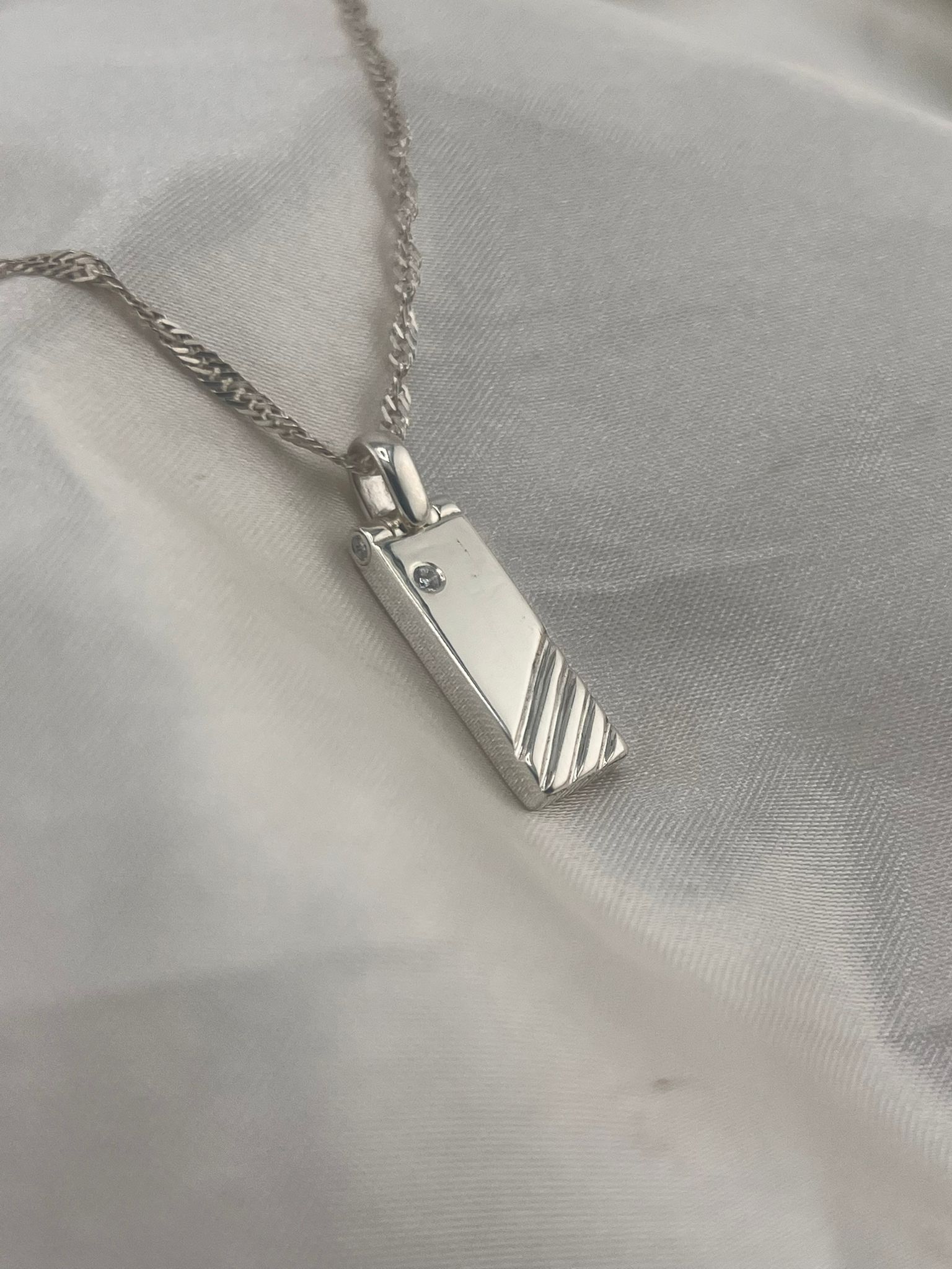This beautiful pendant is handmade from your sentimental silver/gold and features a solitaire stone (2mm) and 2 x peekaboo side stones (1.5mm) with hand carved diagonal accent groove.
